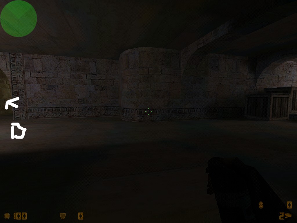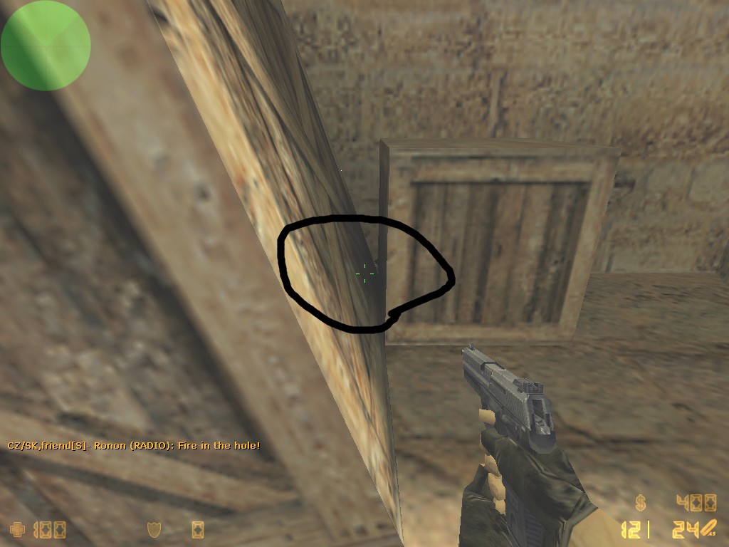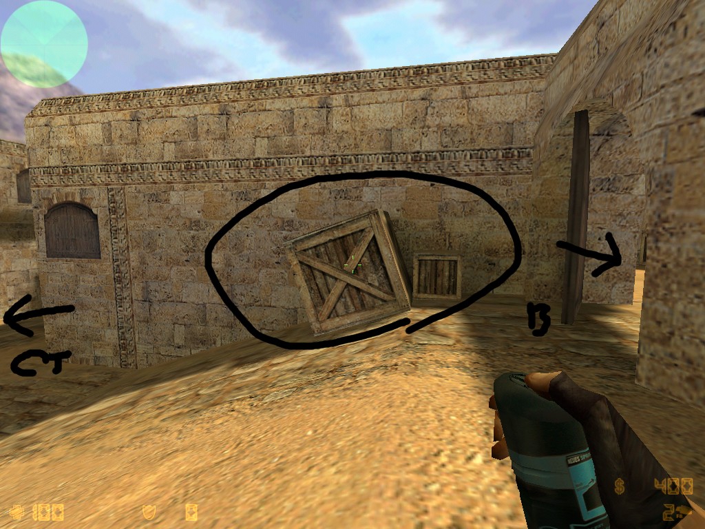 Takže opět v de_dust2 je mnoho bugu do kterých když hodíte granát (flasch) tak se oběví někde jinde a bouchne !! tu máte pár ukázek. Když vycházíte od CT spavnu směrem na bombside B tak si všiměte beden na lavá straně u vrat (často se tam kempí) a do mezery hoďte granát viz obrázek.