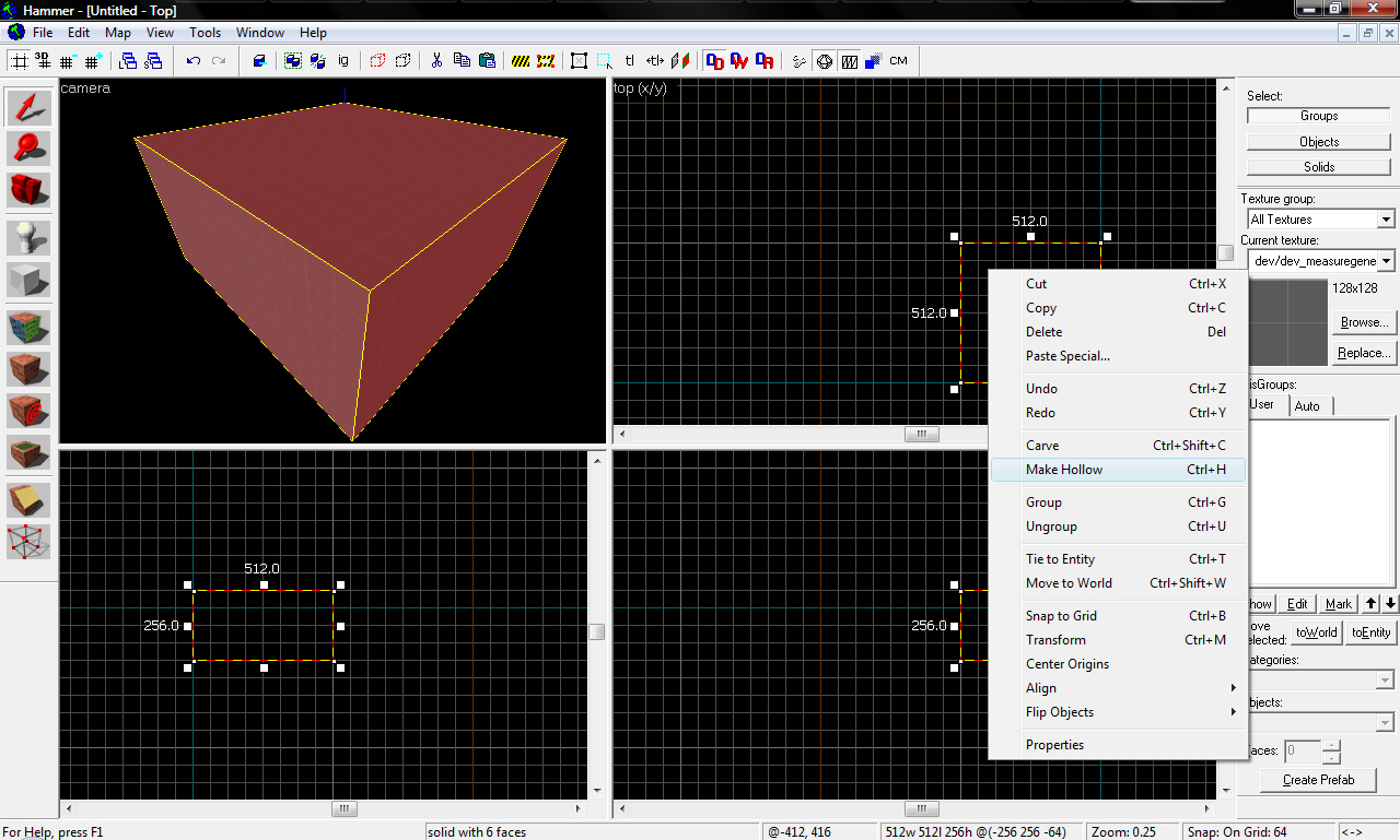 Dále si označíme vytvořený objekt pomocí "Selection tool" zkratka shift+S a v pohledu Top(x/y) na něj klikneme pravím tlačítkem myši a vybereme "Make Hollow" zkratka ctrl+H.
