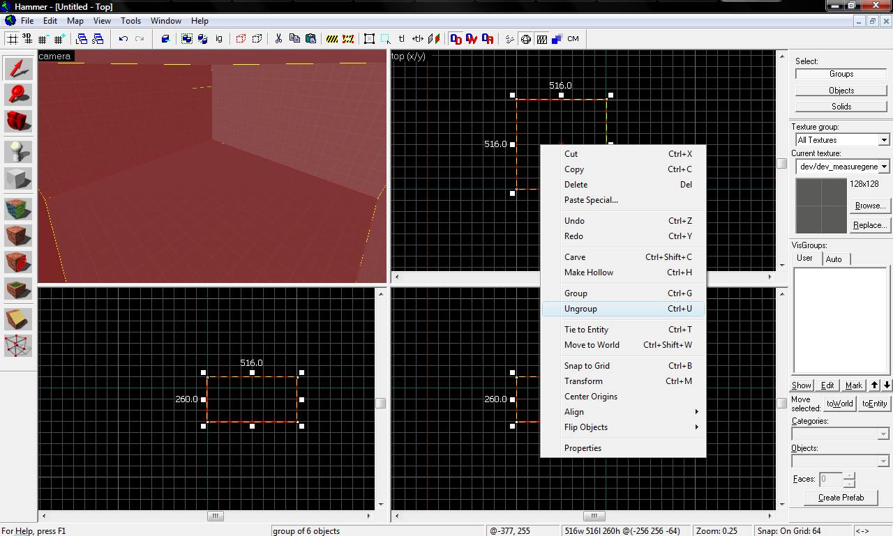 Tak a máme místnost, jenže je tu ještě jeden problém, v místnosti jsou všude stejné textury. to se vyřešíme následovně, v pohledu Top(x/y) s vybraným "Selection tool" klikneme pravým tlačítkem a vybereme možnost "Ungroup" zkratka ctrl+U.